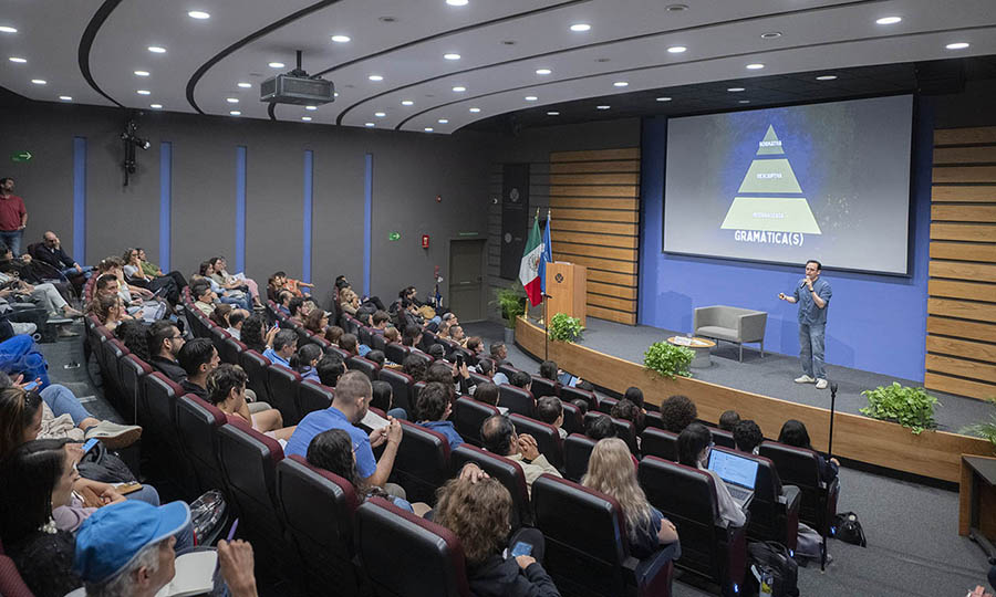 La charla avanzó de manera relajada, desenfadada, en medio de bromas, sarcasmo y risas de la audiencia, tal y como ocurre en sus videos en las redes sociales, mismos que empezó a grabar “porque vi que había un vacío de divulgación lingüística en TikTok”. Así, entre bromas que no eran bromas, explicó que hay tres gramáticas, visualizadas en una pirámide: la normativa, en la punta; la descriptiva, al centro, y la internalizada, en la base. “La más importante es la gramática internalizada que tarda siglos en cambiar, aunque quieran decirnos que la más importante es la normativa. En realidad, el normativismo lo que busca es mantener otras pirámides, sociales y de poder, que nada tienen ver con la lengua”. Luego, dijo que “las y los traductores estamos presentes en los tres ámbitos”, y compartió cómo visualiza sus tres facetas: “La divulgación es como un puente que une la lingüística, y la traducción, con las y los hablantes. También la traducción es un puente que permite ampliar el alcance de un mensaje”.