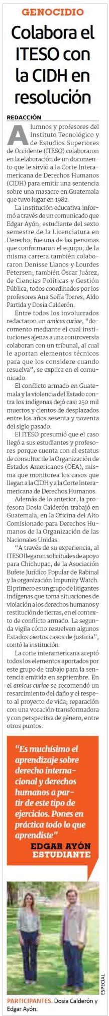 Alumnos y profesores del ITESO colaboraron en la elaboración de un documento que le sirvió a la Corte Interamericana de Derechos Humanos (CIDH) para emitir una sentencia sobre una masacre en Guatemala que tuvo lugar en 1982. La institución educativa informó a través de un comunicado que Edgar Ayón, estudiante del sexto semestre de la Licenciatura en Derecho, fue una de las personas que conformaron el equipo; de la misma carrera también colaboraron Denisse Llanos y Lourdes Petersen; también Óscar Juárez, de Ciencias Políticas y Gestión Pública, todos coordinados por los profesores Ana Sofía Torres, Aldo Partida y Dosia Calderón. (Prensa: NTR El Diario, ZMG, p.5A)